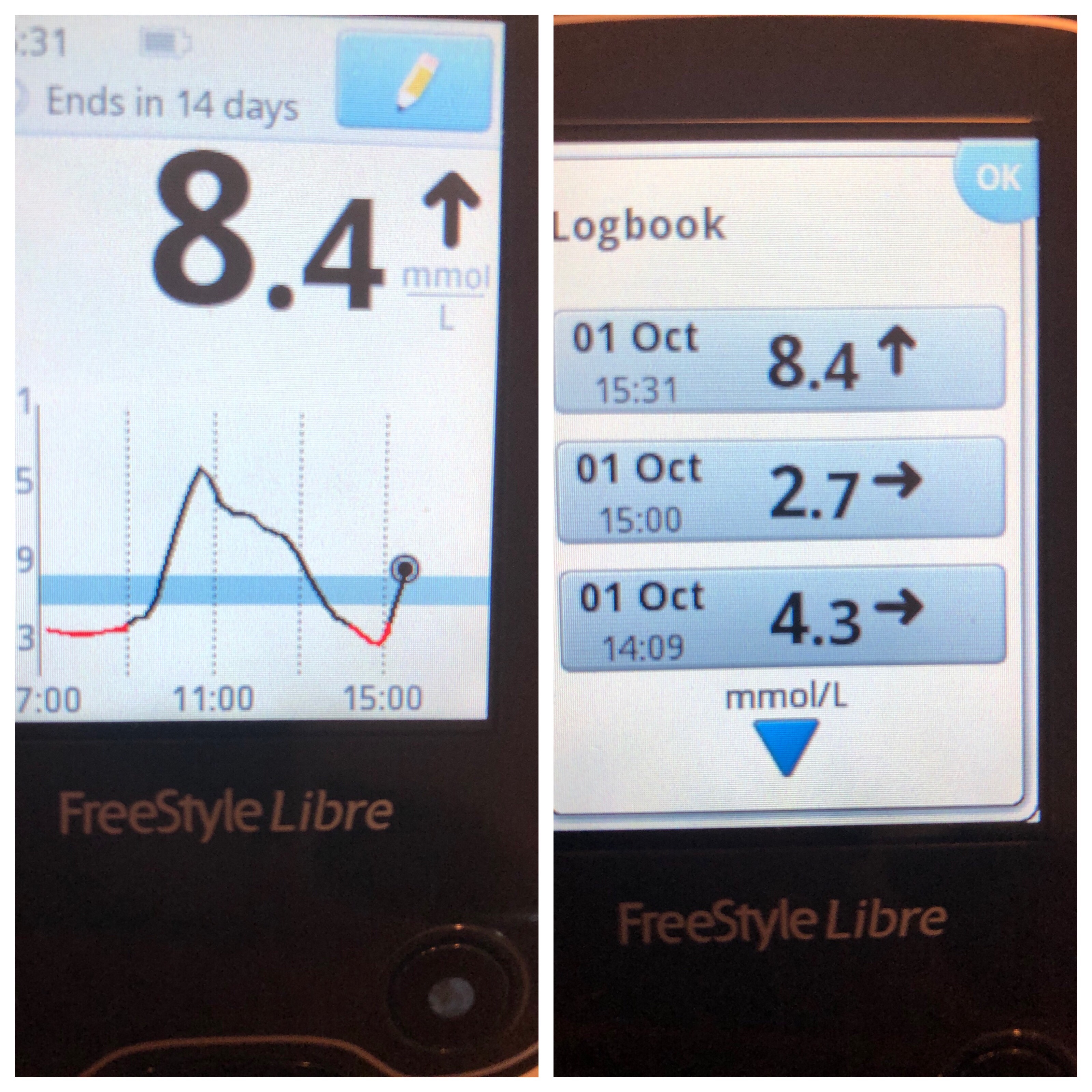 Whenever you scan your meter it tells you using an arrow the direction your glucose is going in, so whether it is going high, low or staying on that level. This for me has been so vital when trying to avoid hypos, as the sensor is on me 24/7 it manages to calculate when I’m going low. Which gives me more control on preventing hypos happening.
